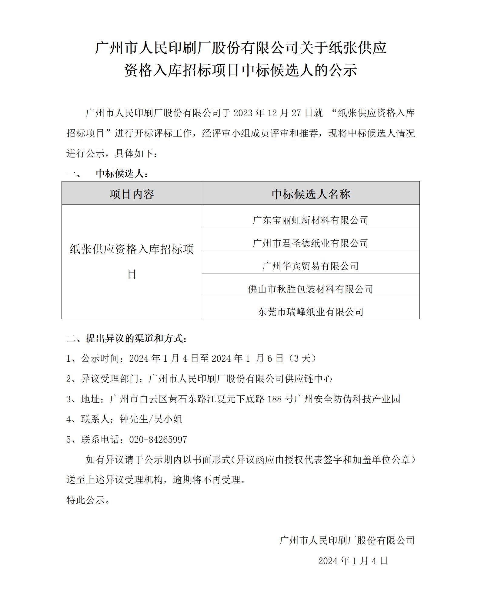 广州市人民印刷厂股份有限公司关于纸张供应资格入库招标项目中标候选人的公示